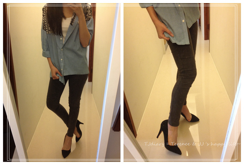 想走簡單大方的路線 所以簡單換了條深灰色窄管褲+白T+圖騰牛仔襯衫